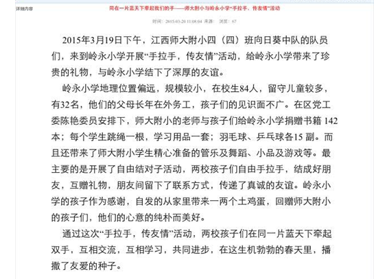 3月18日下午,四(4)全体学生在班主任万婷婷老师带领下来到南昌高新区领永小学与小伙伴们一起活动,度过了一个难忘的下午。活动中,同学们表演了精彩的文艺节目,和小伙伴们同唱同跳,共享快乐时光。孩子们还用自己的零花钱购买了学习和体育用品,并带去自己心爱的书籍,无私送给自己的伙伴,奉献了一片爱心。领永小学校领导为孩子们的善行送上感谢信,小伙伴们也拿出自己家的土鸡蛋和油菜花表达了谢意,场面令人感动、让人温馨。活动结束后,孩子们深有感触,纷纷表示:今天很开心,感受到“赠人玫瑰,手有余香”的喜悦,今后将继续发扬雷锋精神,做雷锋式的好少年,以实际行动展现附小学子的精神风貌。