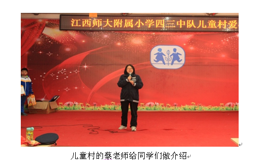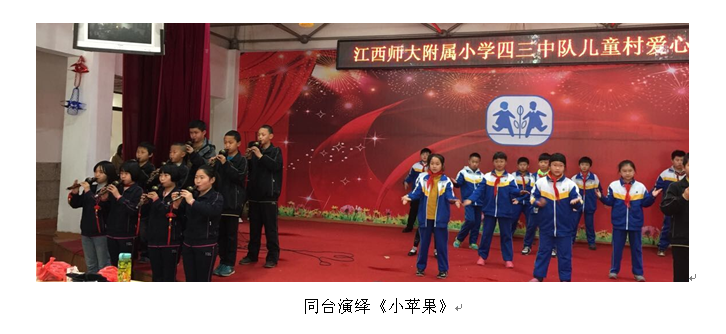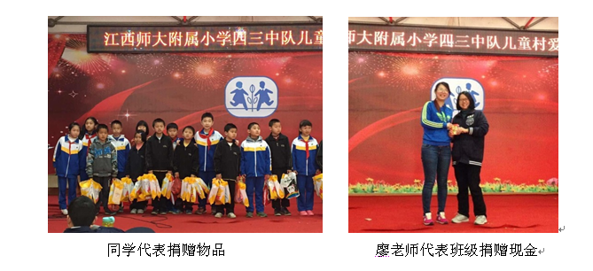 四(3)班的全体同学给儿童村的小朋友们购买了11桶食用油和价值2000多元的文化体育用品,并捐赠了2000元的现金。另外每位同学还向儿童村捐赠了一本自己最喜爱的书籍。这些物品都是同学们精心挑选的,每一份物品都积聚了四(3)班每一位同学的爱心。既能改善儿童村小朋友们的物质生活,还能丰富他们的精神生活。 一份关爱,能打动一颗冰封的心;一份真情,能温暖别人的一生。捐赠仪式结束后,师大附小四(3)班的同学跟儿童村的小朋友们举行了联欢活动。活动由双方小朋友共同主持,共同表演。双方在互相平等、相互尊重的基础上,相处融洽,玩的异常高兴。