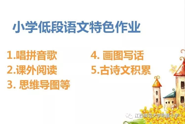 这项作业布置前,年级组老师们先要在本年级组教研活动中,共同商讨出适合本年段孩子的古诗文,然后集结成册。这本书内容浅显、有趣,易于诵读。从儿童心性出发,充分择选音韵和谐,琅琅上口,能打开儿童心灵,启迪儿童灵性的作品。老师会在课堂上教授本书中古诗文以及它的北景资料等有关知识,课后学生在家完成背诵。每堂语文课上课前,学习委员带读前面学过的古诗文,然后点几位同学背诵。这项作业让低段孩子从充满生活气息的、幽默有趣的、贴近孩子语言表达特点的古诗文入手,引领孩子推启学习国学经典之门。