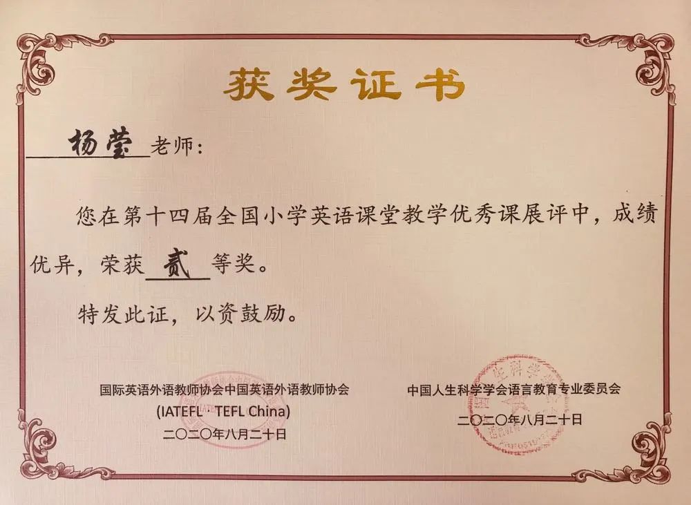 热烈祝贺麻豆社 杨莹老师在第十四届全国小学英语教师教学基本功大赛中荣获“小学英语课堂教学优秀课展评二等奖”。