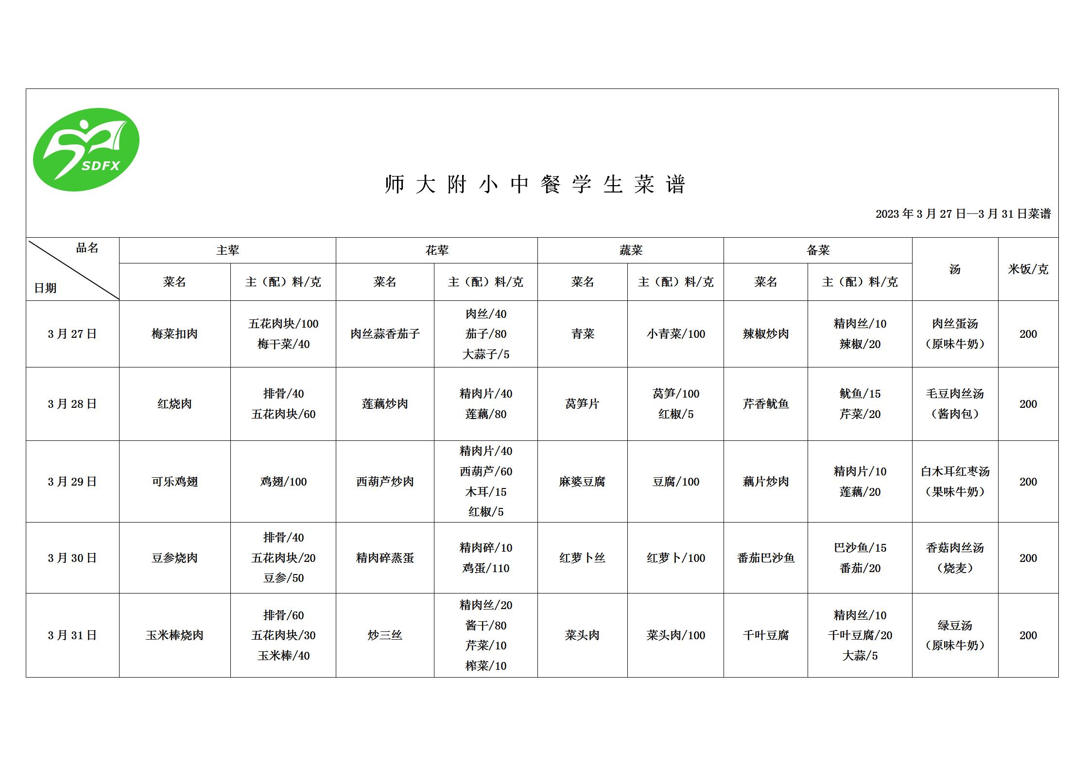 师大附小2023年3月27日-3月31日食谱