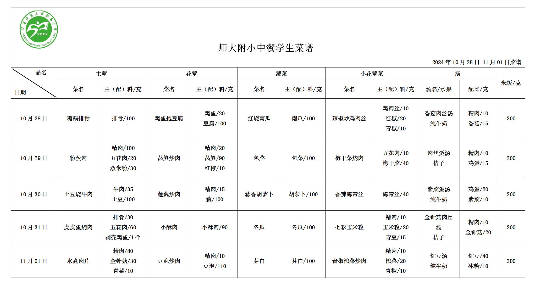 师大附小2024年10月28日-11月1日食谱