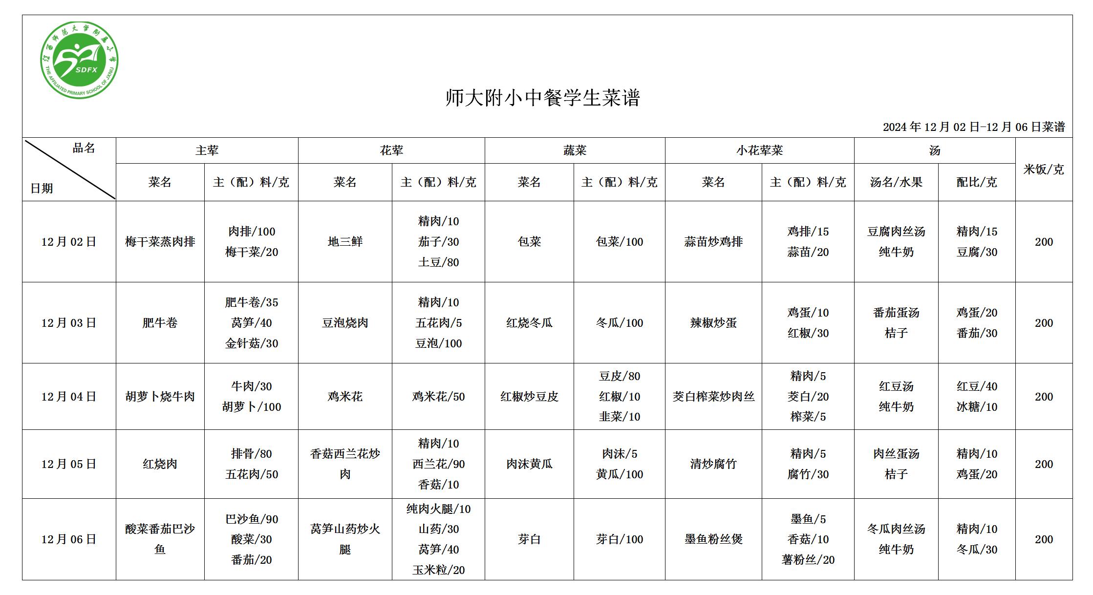 师大附小2024年12月02日-12月06日食谱