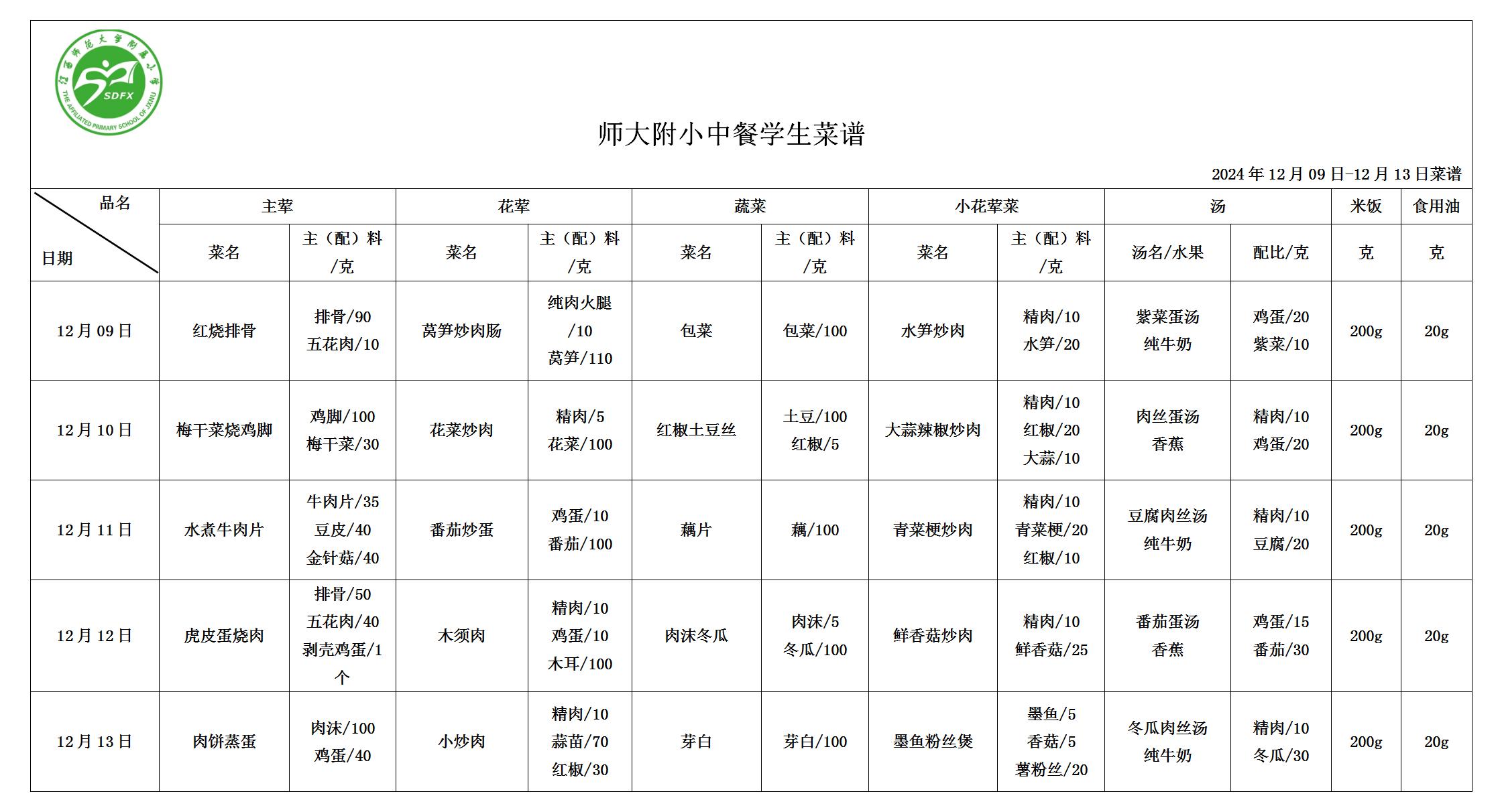 师大附小2024年12月09日-12月13日食谱